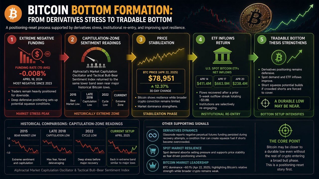 If that process continues while funding stays negative or only gradually normalizes, the short side becomes more vulnerable to a squeeze than the current mood implies. That is the strongest version of the bottoming case, and it does not require declaring that a full-cycle bull market has already begun.