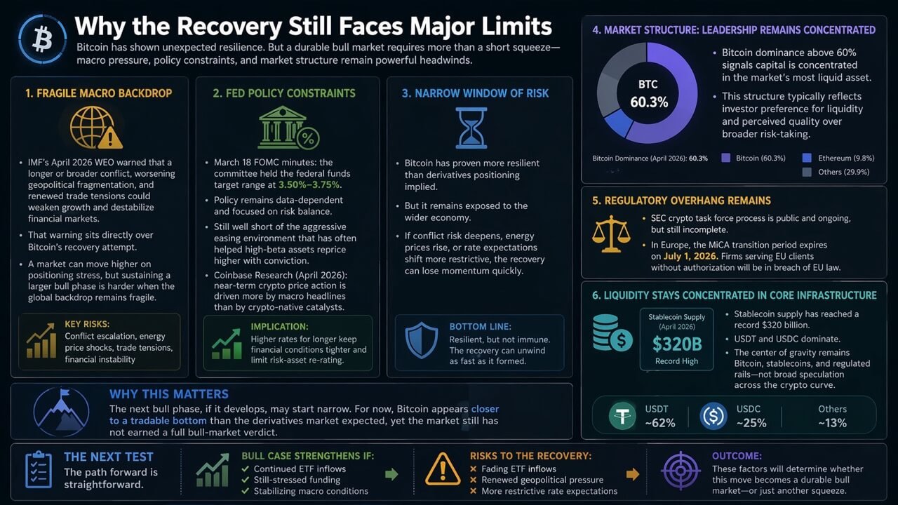 The IMF’s April 2026 World Economic Outlook warned that a longer or broader conflict, worsening geopolitical fragmentation, and renewed trade tensions could significantly weaken growth and destabilize financial markets. That warning lands directly on top of Bitcoin’s current recovery attempt.