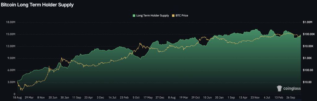 On-chain data reinforces the structural argument. Long-term holder (LTH) supply has remained at historically elevated levels through Q1 2026 despite price volatility, consistent with accumulation rather than distribution.