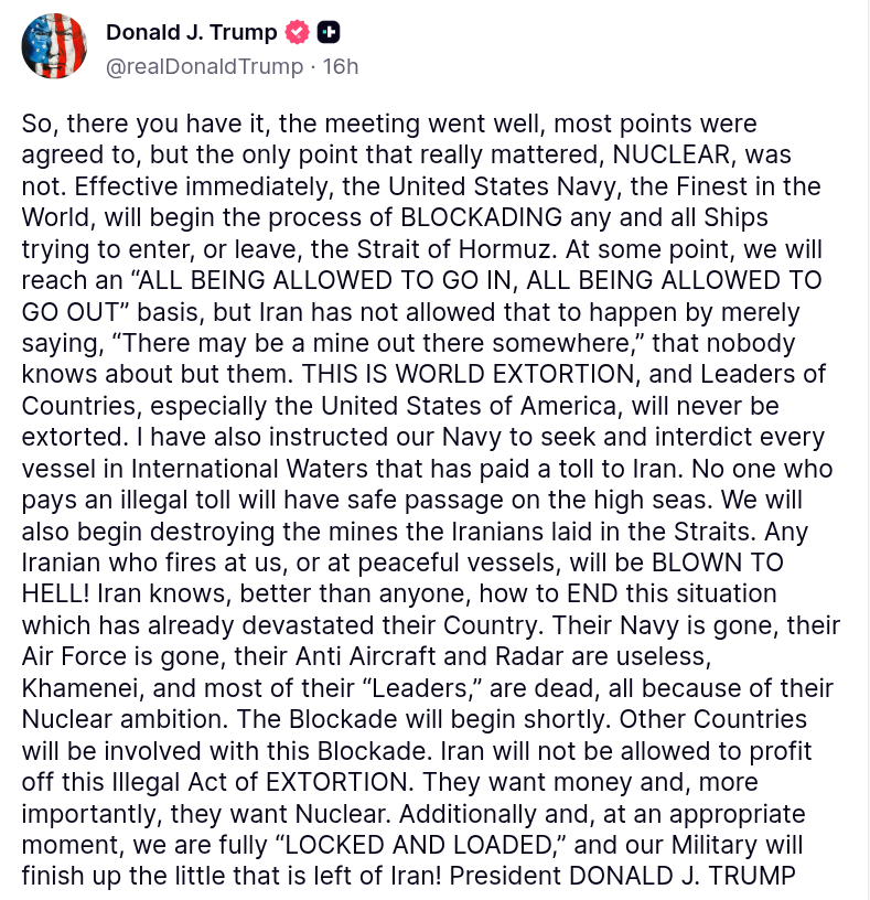 “It appears that Trump’s long-term plan is to blockade Hormuz, gain control, then begin letting traffic flow freely,” trading resource The Kobeissi Letter commented in a response on X.