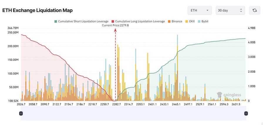 Liquidation data adds pressure to this zone, with $2.5 billion in leveraged longs sitting below $2,150. A break below this level could trigger forced selling into the $2,050 to $1,900 range.