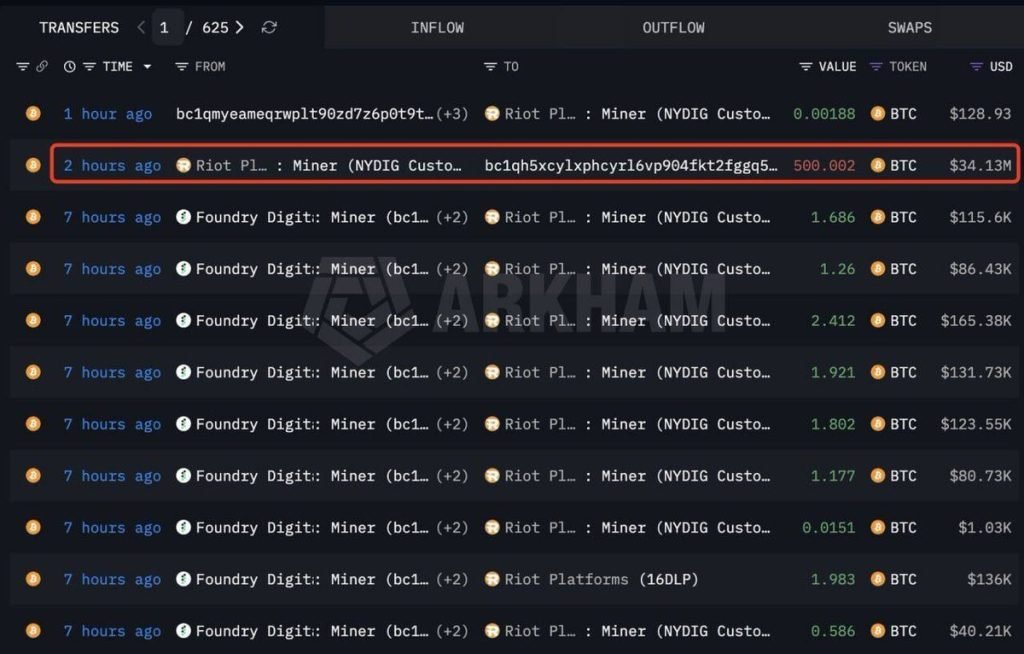 Blockchain intelligence platform Arkham flagged a separate 500 BTC outflow from a wallet attributed to Riot on Thursday, suggesting the selling didn’t stop when Q1 closed.