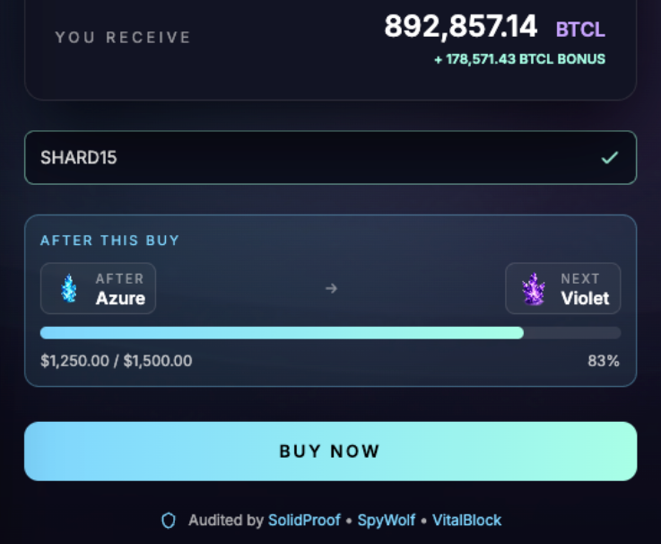 The token is currently in Phase 4 of its presale at $0.0014 per BTCL, with the next phase stepping up to $0.0016 and the launch price set at $0.0310. Over $2.5 million has already been raised, and the minimum to get started is just $10.