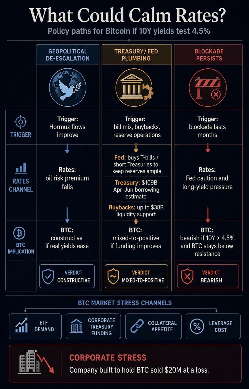 The market question is direct: if bonds keep selling off, does Washington need to reduce geopolitical oil pressure or ease Treasury and Fed plumbing before Bitcoin can retake risk appetite?