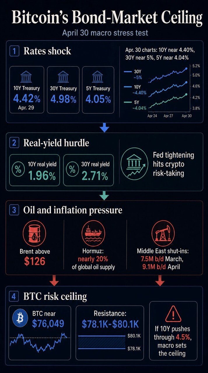 Bitcoin’s April rebound is now facing a two-front macro test. The official Treasury curve for Apr. 29 placed the 10-year yield at 4.42%, the 30-year at 4.98%, and the 5-year at 4.05%.