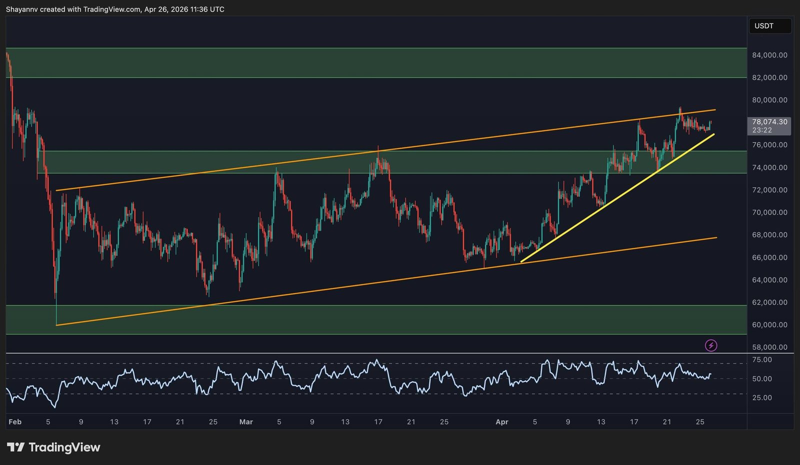 The 4-hour chart has developed an interesting two-layer structure. The broader ascending channel from the February lows frames the overall recovery, while a steeper short-term trendline that emerged in early April has acted as the actual engine of the recent push, driving price from around $68k all the way to current levels near $78k in three weeks.