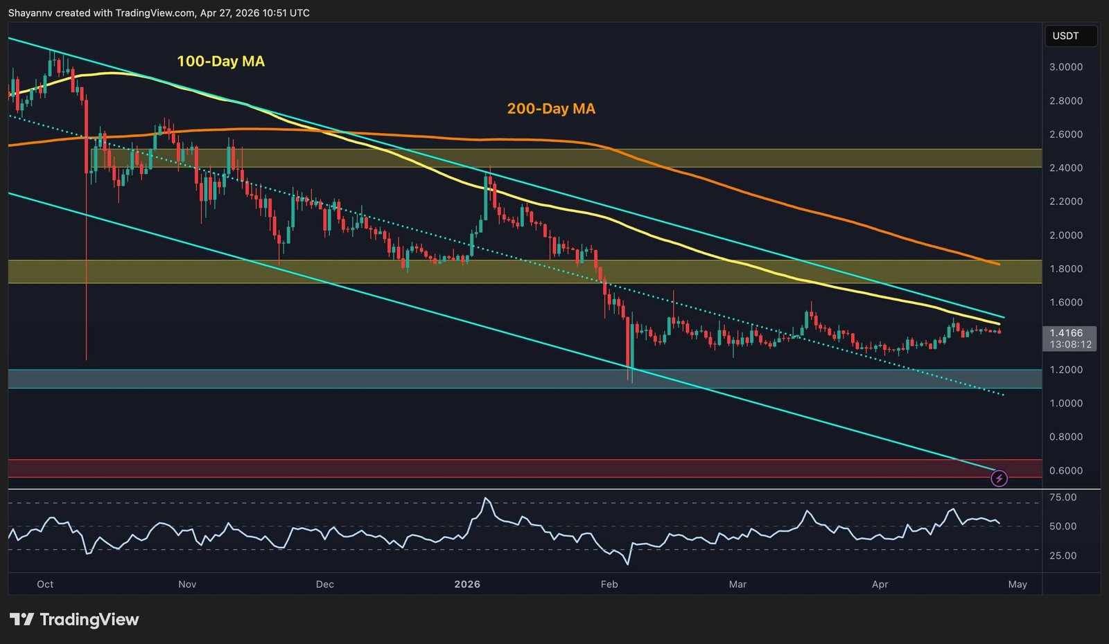 A confirmed daily close above $1.80 would be the first meaningful technical break in this correction, opening the door toward the $2.40 supply zone where a heavier distribution band sits. On the downside, the trendline that price reclaimed in recent weeks and the February wick low at $1.20 remains the hard floor.